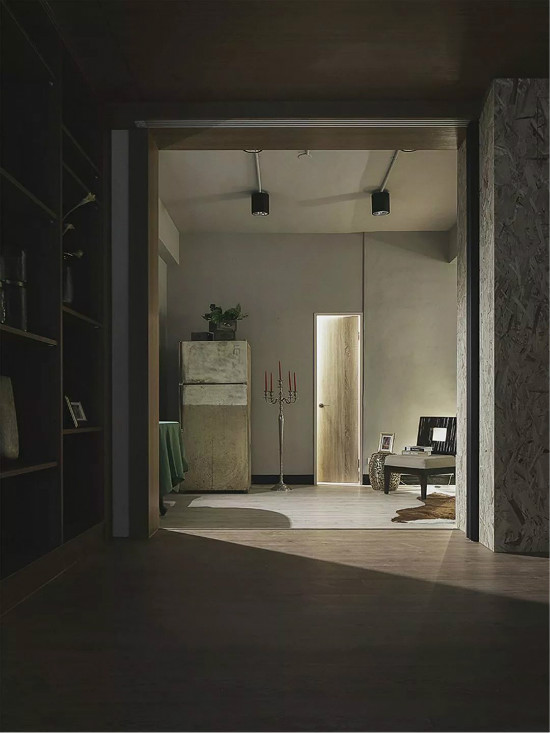 重复使用同质性建材并整合原有梁柱的高低差,将电视主墙、裸露的吊隐式冷气、房门与柜体皆拉齐至2.2米的天花基准线。