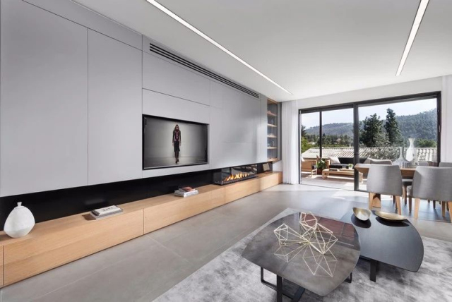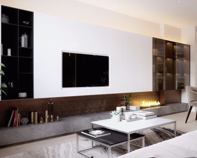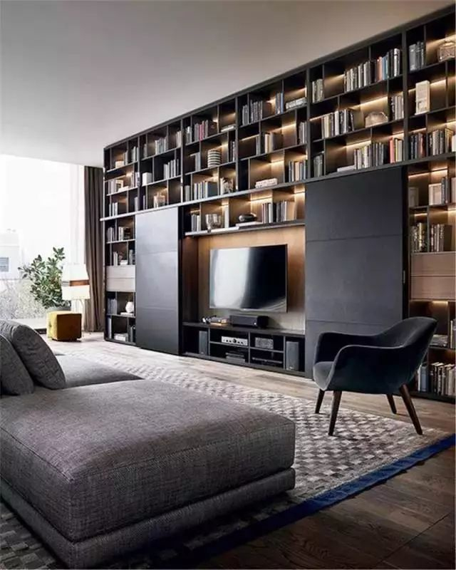 内嵌于墙面的电视柜最节省空间,根据墙面特点和电视的大小,现场定制收纳柜,容量大又整齐,可以满足大部分的公共物品收纳或图书、藏品的收纳。