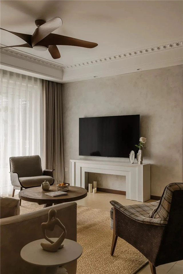客厅电视机背景墙相对比较短,设计师巧做减法,仅仅一个壁炉平衡空间并增添美感。原有的复古瓷砖与新加入的壁柜、绿植、摆件、吊扇等融为一体,弥漫出大自然的本色和芬芳。