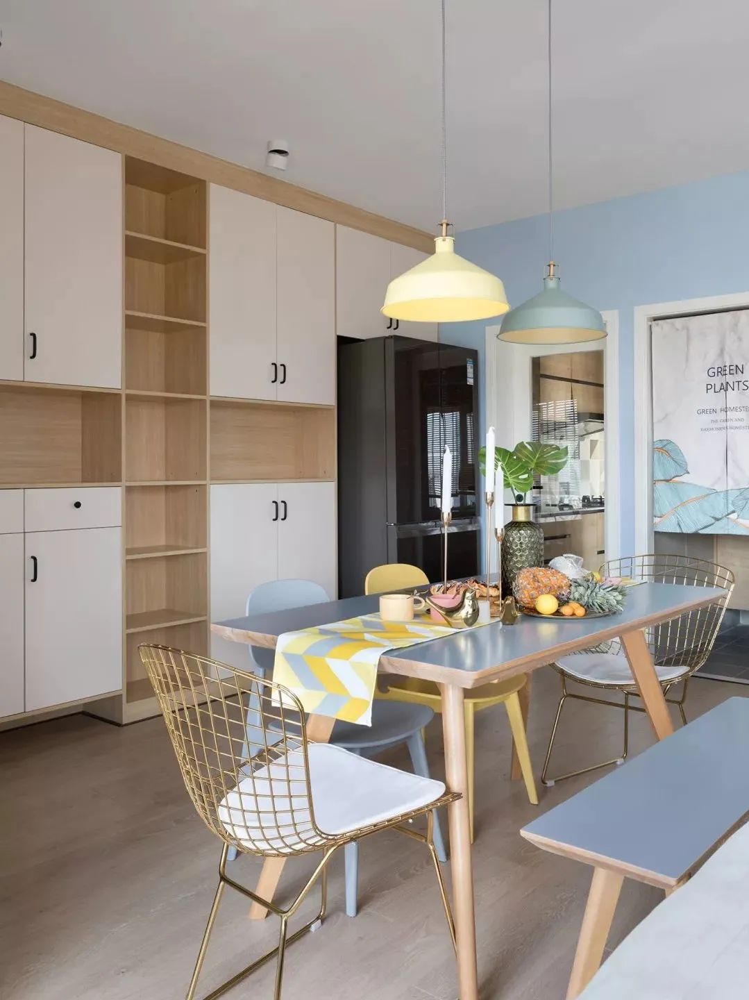 由于空间结构,餐边柜与玄关鞋柜组合设计,横竖交错的开放格设计,搭配封闭式柜体,让更多物品都能收纳其中。顶上两盏灰黄配吊灯,搭配与墙体同色的蓝色餐桌面及花瓶烛光等装饰,使得餐厅空间充满活力与浪漫!
