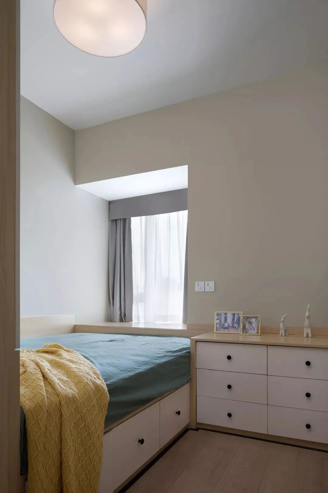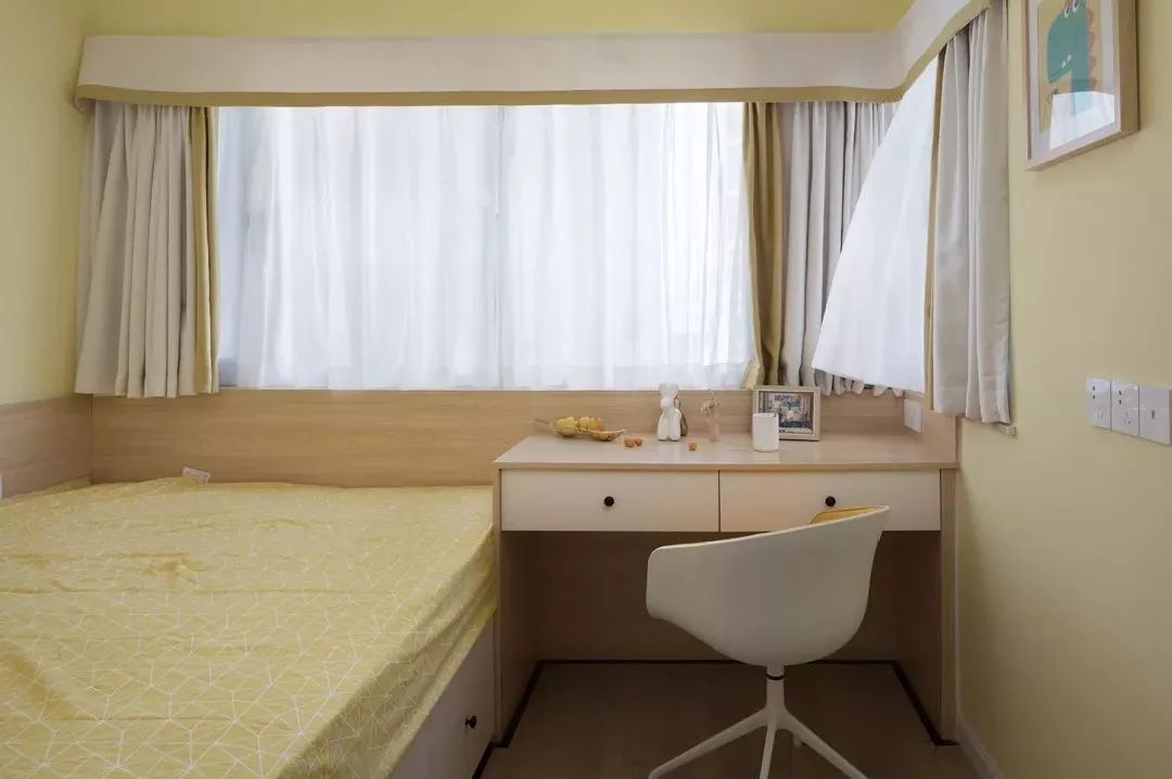 儿童房是淡黄色为基调,增加清新有活力,同样的定制榻榻米+书桌柜一体化设计,床的一周墙面加上木质护墙板做保护,让孩子使用更加美观、安全。