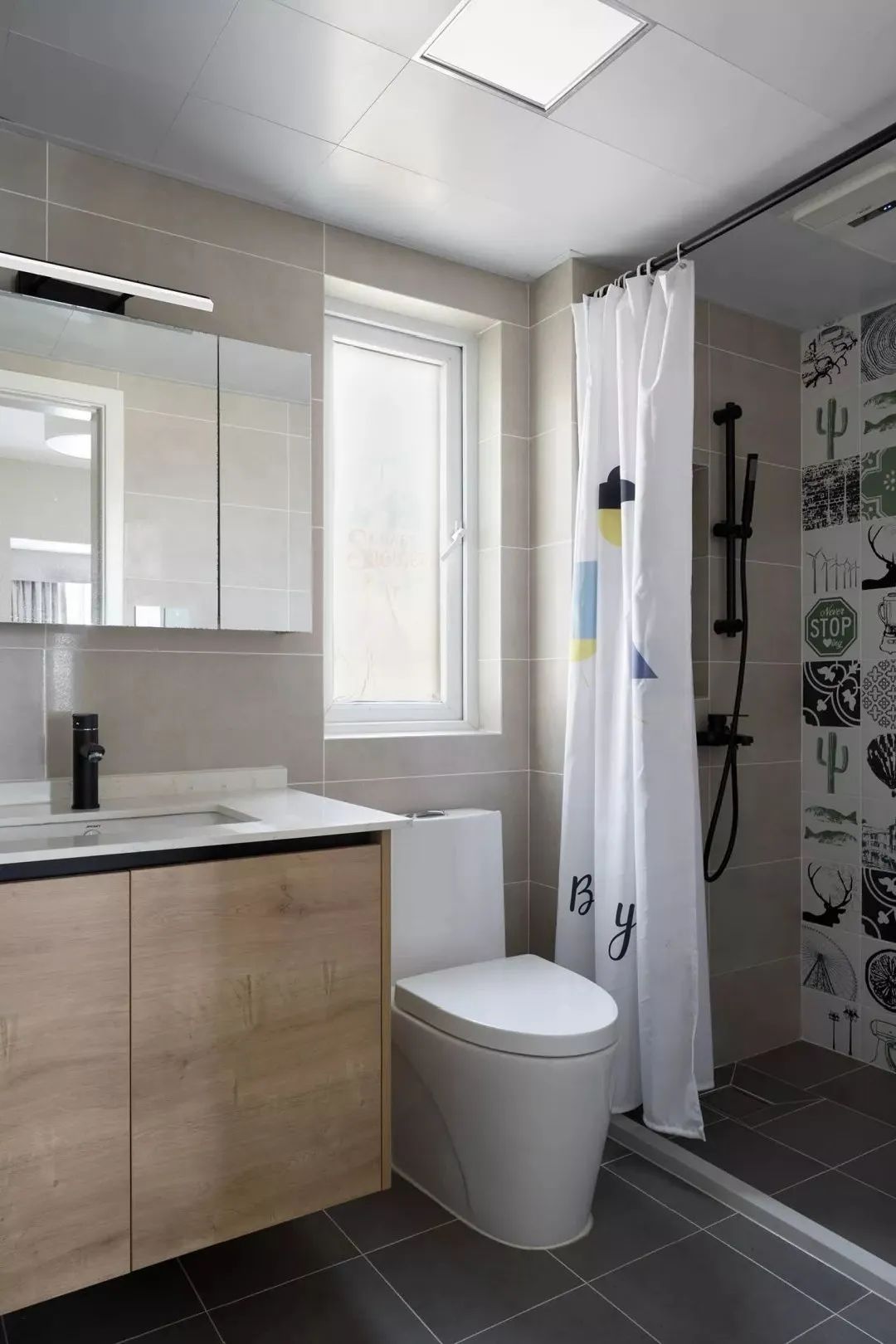 卫生间灰色地砖搭配原木色洗手柜+镜柜设计,让空间更加有纵深感,挡水条+浴帘设计使卫生间干湿分离,方便使用。