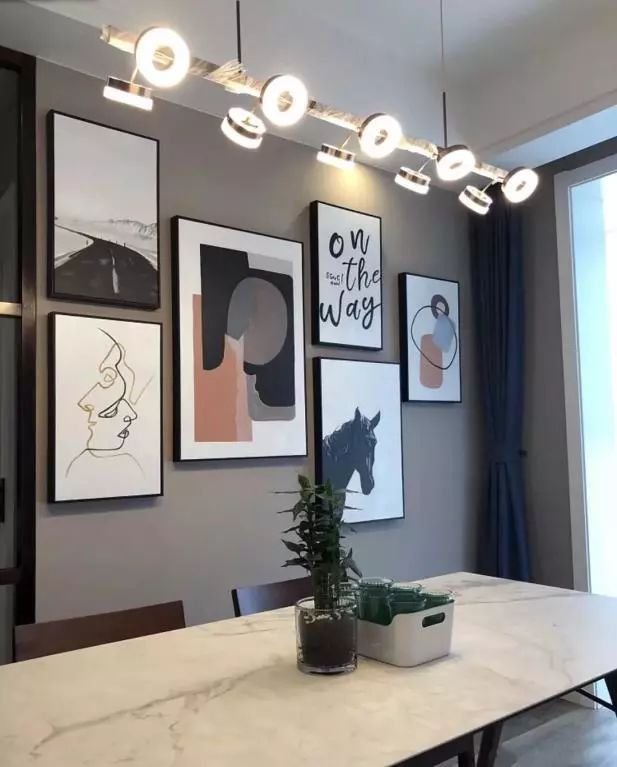 墙面的颜色都是一样的灰色调,挂了很多个性的装饰画,整体视觉效果超酷的。