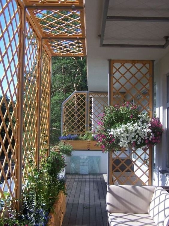 在阳台边上加上木窗格,再在边上种上自己喜欢的绿植花卉,这样太阳光只能从木窗格穿过,柔和了太阳光,还有一定的光影效果;另外这木窗格也具有一定的防护功能,如果家里有小孩或是老人的话。