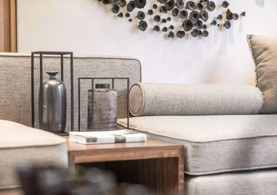 客厅摒弃繁冗复杂的装饰,用素雅的色调和干净利落的线条,表现一种由古典美和现代美相互融合的温柔力量。整屋利用浅原木色搭配黑白灰颜色铺陈营造出一种治愈氛围。颜色自然过渡,协调统一,降低了对人们的视觉刺激,让空间更显高大挺拔。在沙发上选用禅意质感的棉麻布料,大画幅的立体侧向画纯粹而深思。