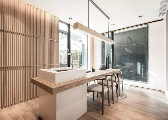 厨房和餐厅与客厅想通,吃饭的时候亦能享受阳光照进餐厅的那份温暖。简约开放式的木色厨柜搭配黑色台面,餐厅自然系地老木头造型吊灯搭配木质桌椅,灯光层次变化,整体空间显得更加干净。在中正的布局中,现代家居的简练与日式风韵的自然交织,将情调融化在空间里。