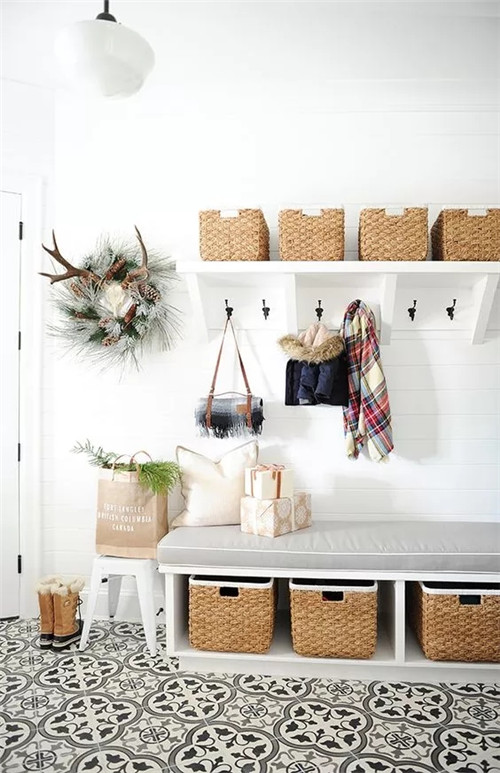 如果家里常住的人数不多的话,更建议只装隔板架,其它的比如板凳或挂钩就不要布置了,直接留白,这样既可以保持空间的通透,整个空间的视觉也会有扩充的效果。