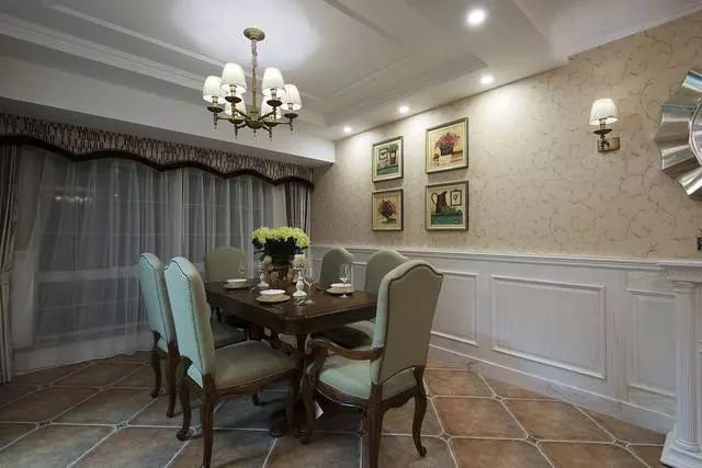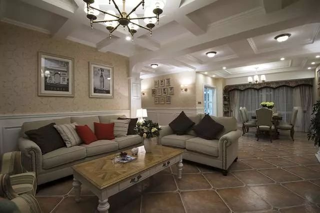满满复古气息的一个美式风别墅客餐厅,仿古地砖大气又温馨,吊顶也好看!