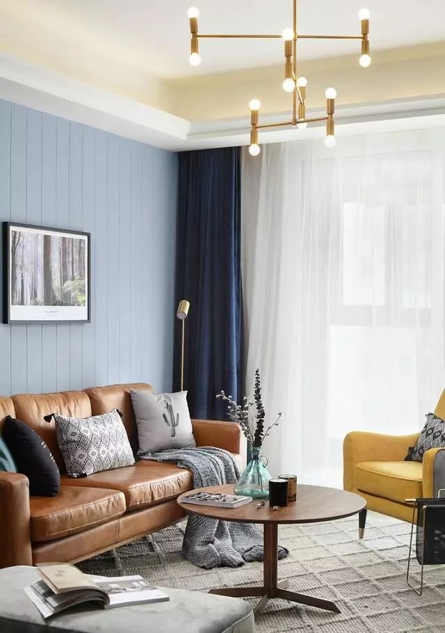 沙发墙装了蓝色护墙板,很清爽的颜色,皮质沙发增加质感,柠檬黄边椅让空间更活泼。