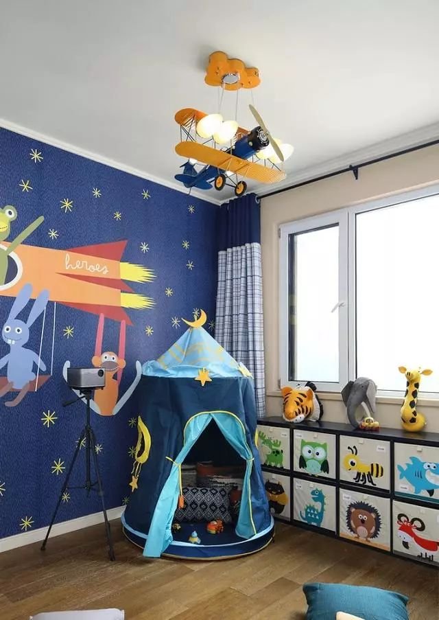 这是孩子的娱乐空间,没有放置上下床铺,想着等孩子大一点再买合适的,不然长大了不实用。