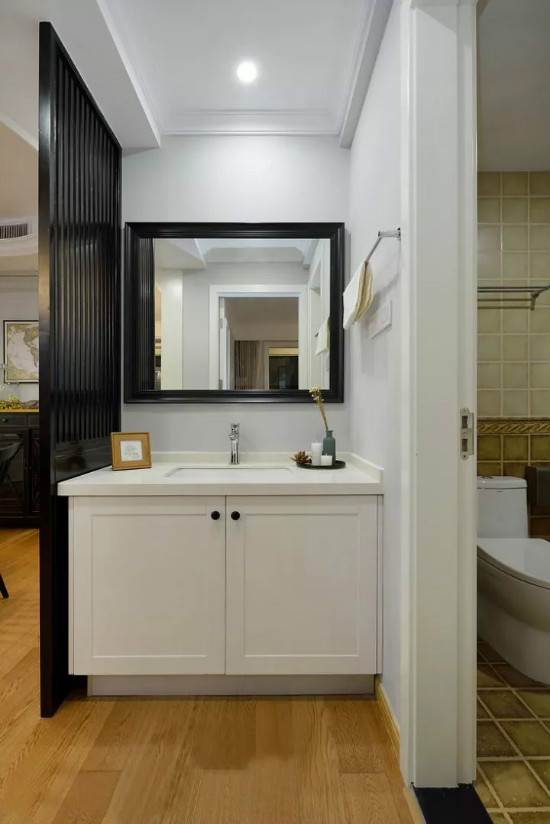 但值得注意的是,如果入口处到卫生间的通道是狭长的走廊式,就不建议这样做,因为这样不但妨碍家里的行走动线,而且看起来非常突兀,影响整体美观。