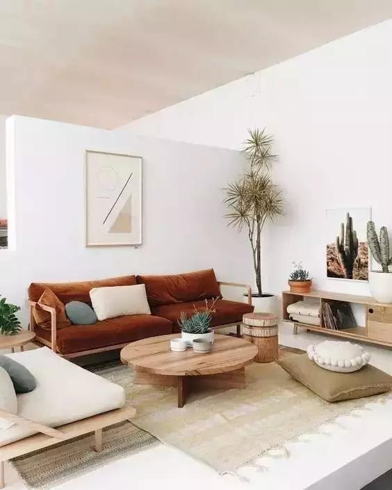 木质家具和亚麻材质的抱枕带来的舒适感