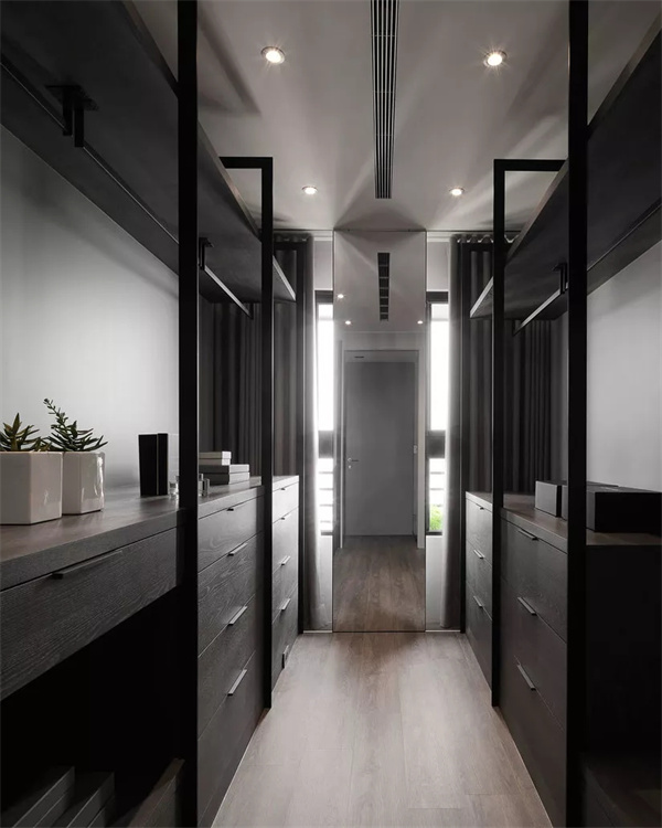 无论是衣柜还是衣帽间,衣服挂着一定比叠起来放要省事得多。而且衣服叠起来不仅找起来麻烦,还容易压出褶子,所以衣帽间的隔板最好少一些,留出充足位置作为挂衣区。