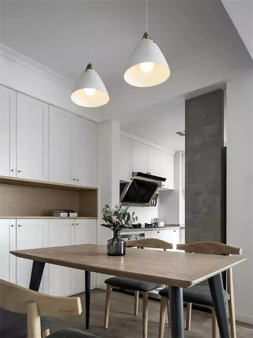 ▲ 木质与灰色的点缀,让用餐空间变得简约时尚而又精致。半开放式厨房开阔空间,实现了空间的通透性和家人之间的情感交流。