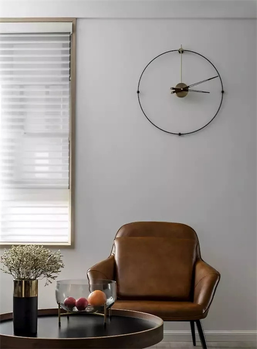 ▲ 优雅而舒适的棕色皮质单人沙发颇具艺术感,墙面简约不失精致的造型壁钟,为空间增添了轻盈灵动之感。