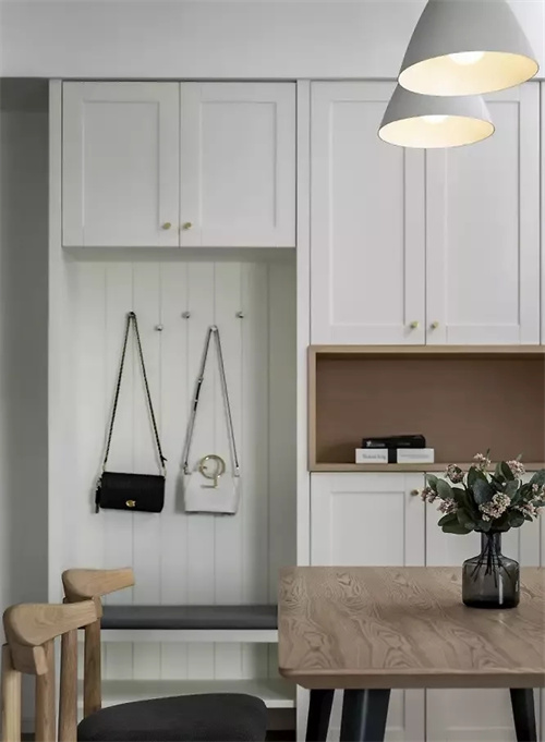 ▲ 一整面墙的储物柜充分满足屋主的收纳需求,部分留空的设计便于常用物品的取放,视觉面积上也更大更开阔。