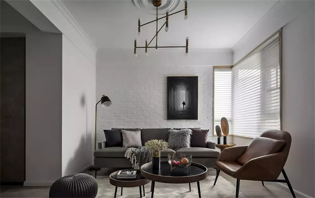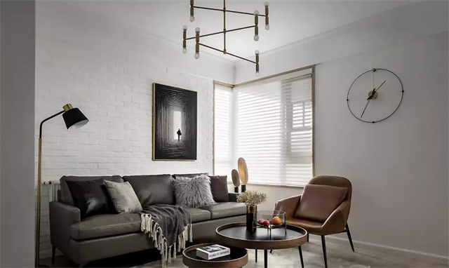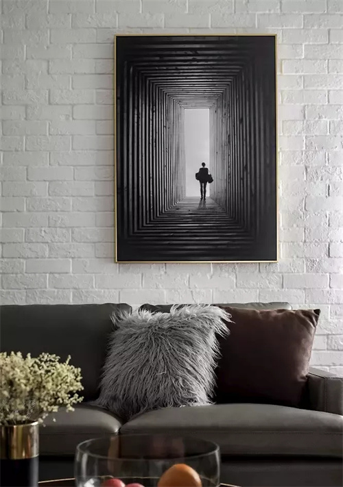 ▲ 沙发背景墙采用白色文化砖,一幅黑白画作提升气场,带来空间视觉上的延伸感,打造独具意境的艺术格调。