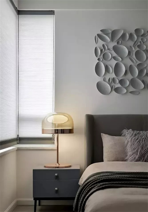 ▲ 极简边几上摆放了玫瑰金质感的床头灯,时尚而又安稳,在细节中体现品质感。