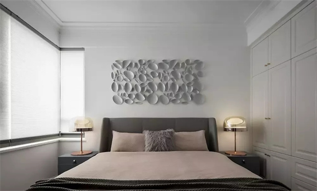 ▲ 主卧以灰白两色为主调,金色元素的加入,使空间呈现出轻奢与高级质感。柔和的基调营造放松自在的氛围,藕粉色床品使空间弥漫着梦幻与浪漫。