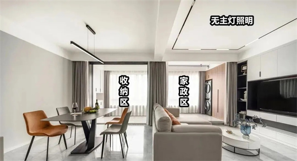 大横厅带阳台,沙发后是餐桌,整个阳台同样是一分为二利用,一半做家政区,另外一半兼顾收纳+休闲: