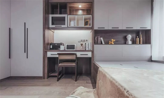 如果用一整面的柜子作为床头背景墙,那么可以将其中一个顺手放物又不干扰睡眠的地方挖空,作为展示储物的空间,增加空间的实用性与艺术感。