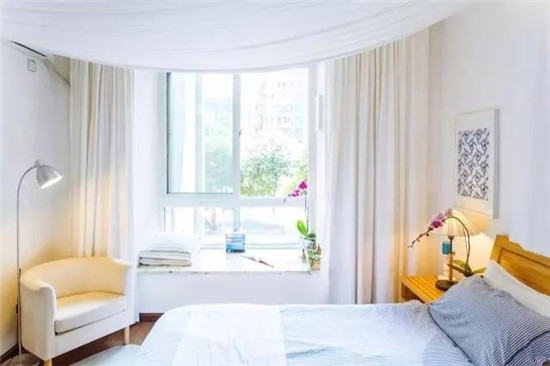 还有那面大大的飘窗,搭配两侧散发柔和灯光的壁灯,睡觉也可以很舒心。