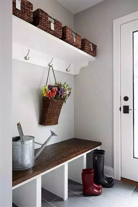 简简单单的拐角小玄关,一张换鞋凳、一个隔板挂架,非常适合单身一人的居住的业主。