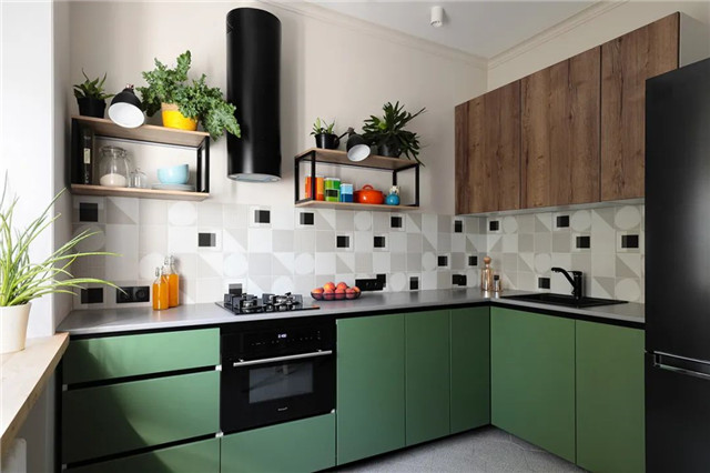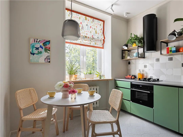 而厨房则采用了绿色橱柜和温馨阳光的用餐区