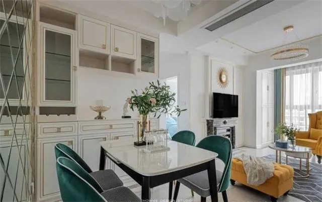 ▲餐厅整体简洁优雅,墙上经典的线框造型搭配描金,赋予整个空间奢华质感。餐厅侧面打造多功能柜体,满足餐边收纳与装饰。