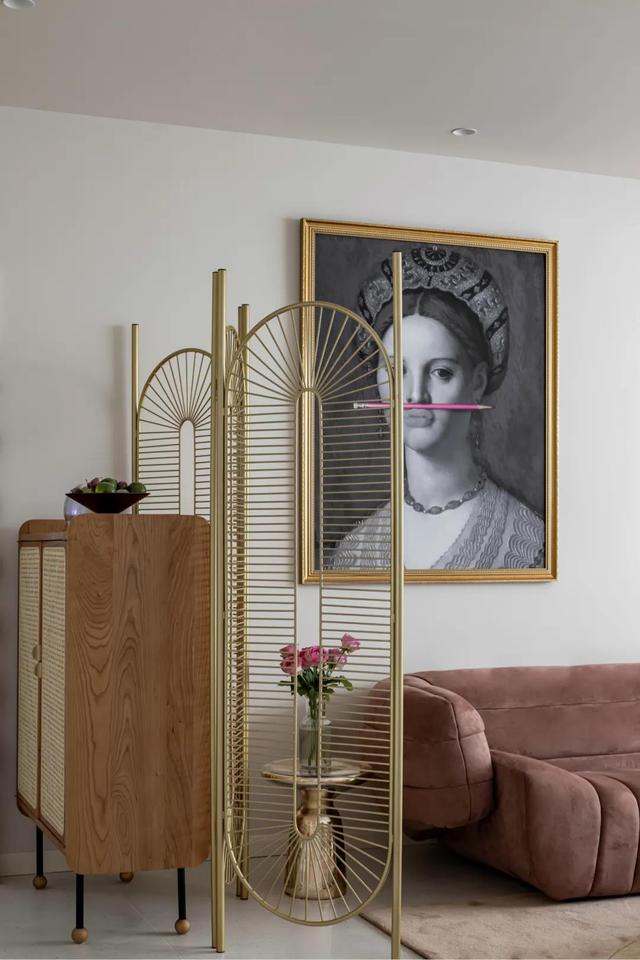 入户门的左侧,摆放了一个涟漪边框的哈哈镜,既能简单房东外出前整治相貌,又能起到夸大空间感和化妆房子的效率。