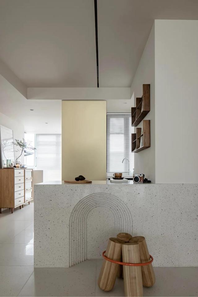 灶间是半盛开安排,进口的右手边定制了酒吧台,从视觉上保证了灶间的独力性。灶间酒吧台沿用了大理石材料质量,外表减少了内凹多层拱形化妆,搭配木墩矮凳,产生了一个袖珍的换鞋区。