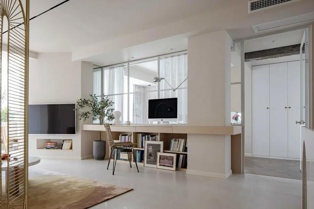 室内窗向寝室目标内推,留出的空间恰巧定制了书案和书橱。书案右侧和承重柱举行贯串,不只贬低了承重柱带来的高耸感,也提高了完全的场面性。书橱是盛开式安排,坐落书案的下方,为房东拿取典籍供给了便当。